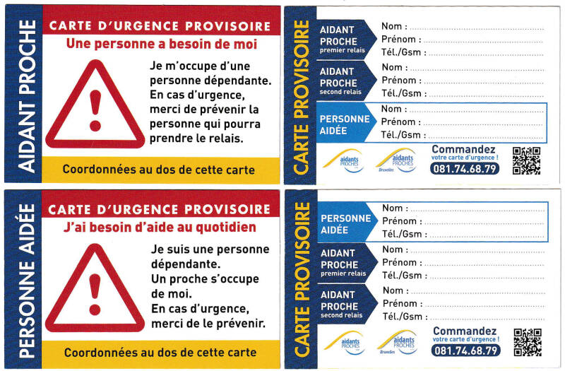 L'asbl Aidants Proches a créé une carte d'urgence pour les aidés et les aidants proches. Vous pouvez faire la demande en ligne en cliquant sur la photo ci-contre.